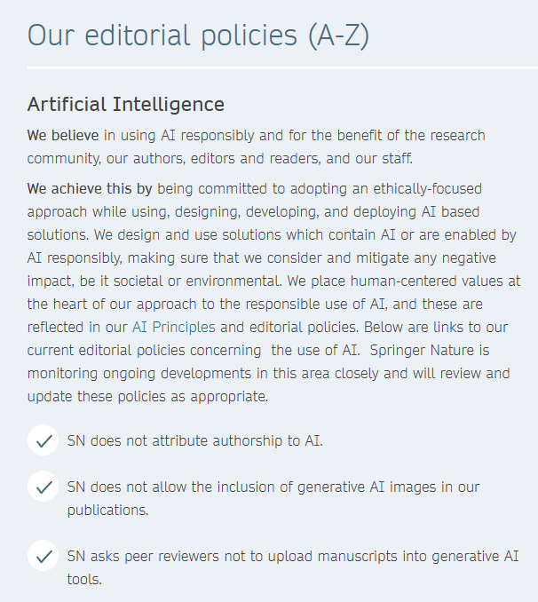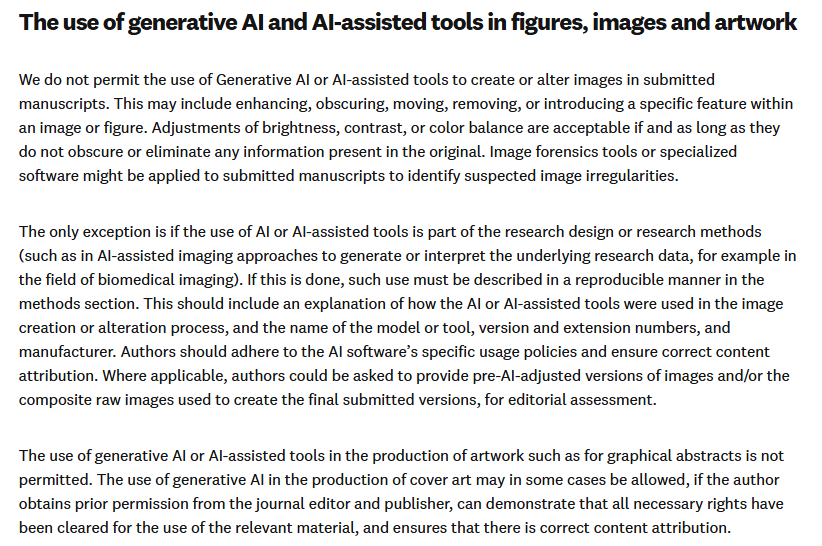 Some large publishers explicitly state that they do not allow generative-AI images in the scientific figures inside manuscripts. This includes Springer Nature (e.g., Nature, Scientific Reports) and Taylor & Francis. These rules are driven by copyright uncertainty, research integrity risks, and the fact that AI may “invent non-existent details.”