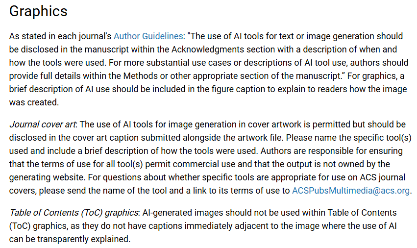 ACS (American Chemical Society): Allows AI-created cover art if authors disclose the tools used and ensure the output does not violate copyright/licensing rules.